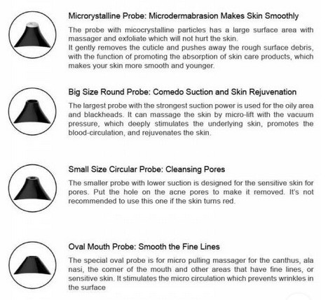 این پروپ برای نواحی خاصی جهت ماساژ و پاکسازی پوست از جوش های سرسیاه در تواخی اطراف دهان و مناطق دیگر باعث از بین رفتن خطوط بسیار ریز نیز خواهد شد چرا که مکش دستگاه باعث جریان گردش خون در پوست می شود و از بروز چین و چروک ها نیز جلوگیری می کند .