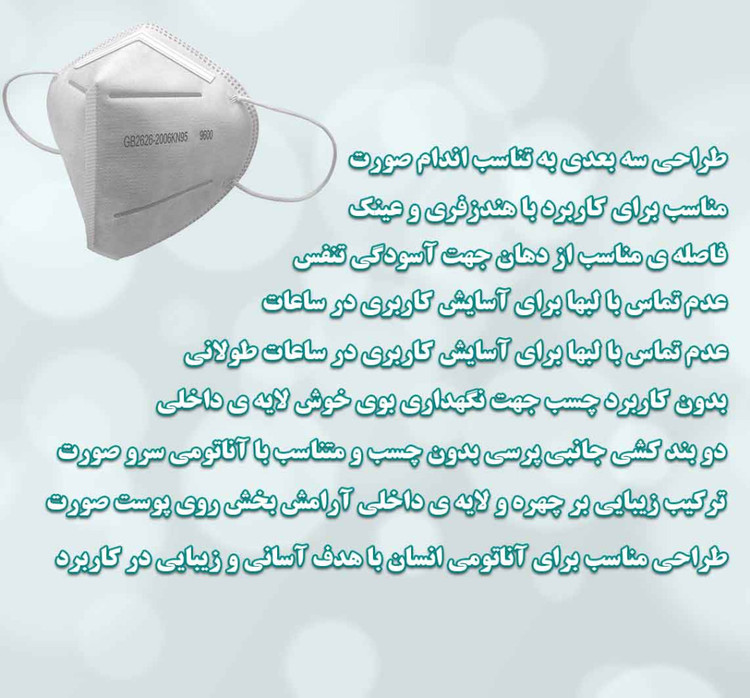 این نوع ماسک به صورت چهارلایه با دولایه فیلتر مناسب محیط های شلوغ و پر رفت و آمد است. در هوای آلوده و در شرایط کرونا بهترین نوع ماسکی است که پیشنهاد میگردد.